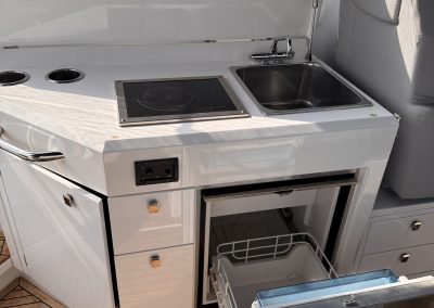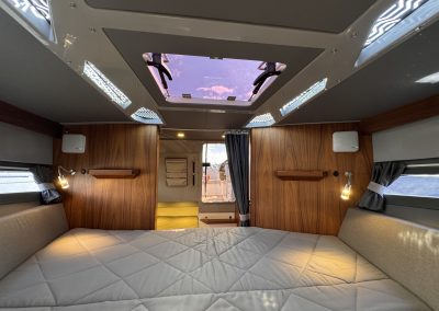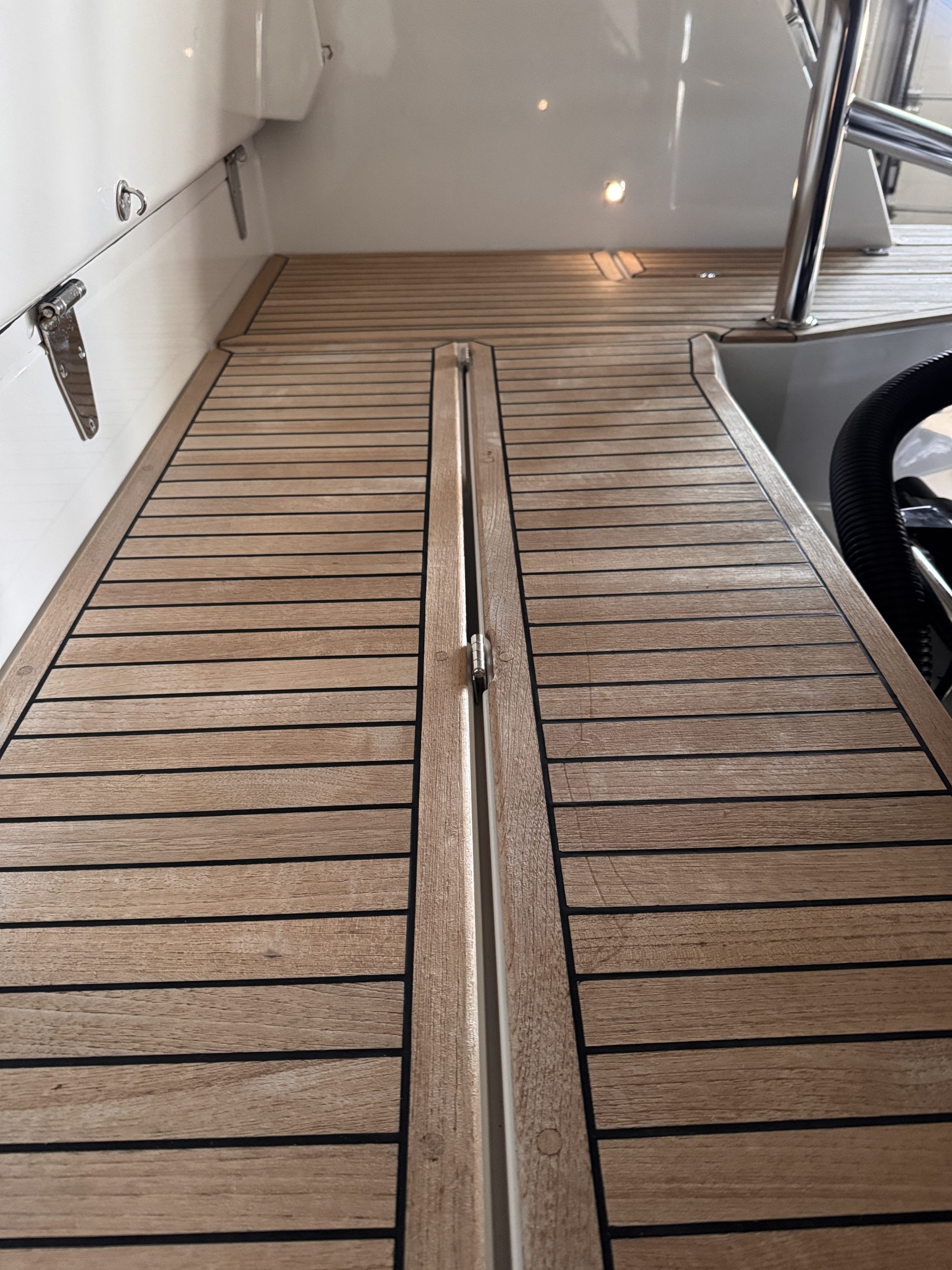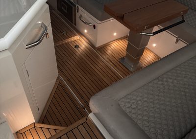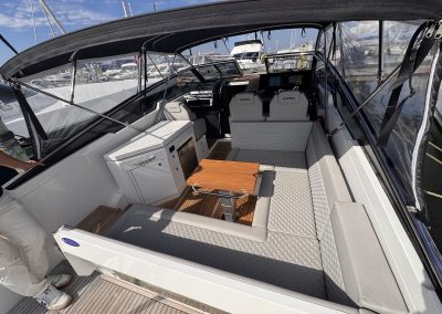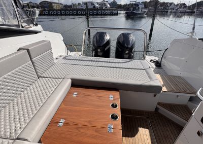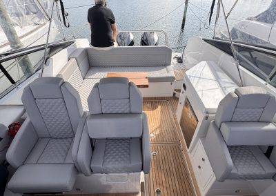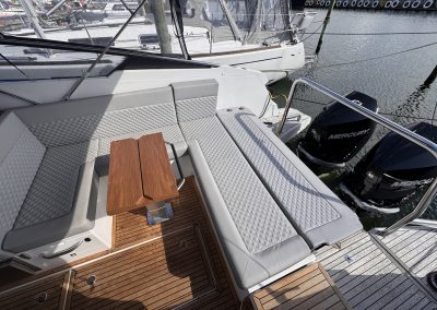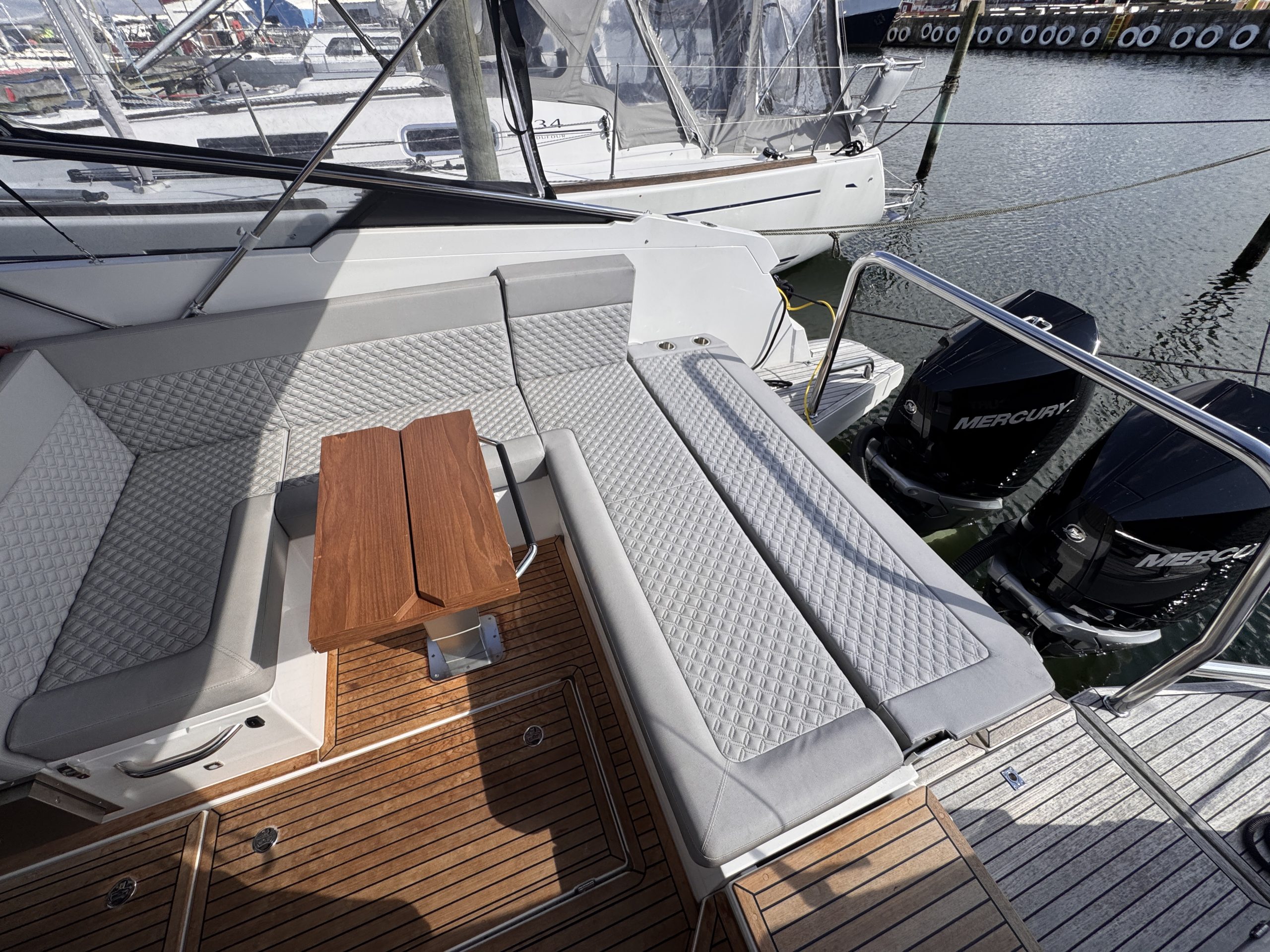 ✅ Stor U-soffa med fällbart ryggstöd akterut samt elektriskt sänkbart bord för att göra om hela ytan till en solsäng! Fungerar även som en nöjkoj för 2.