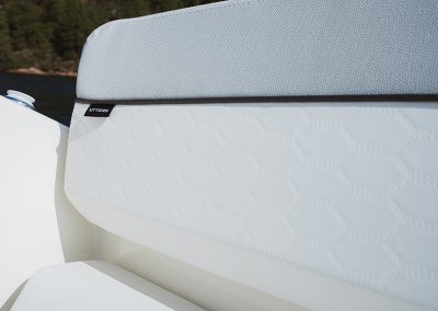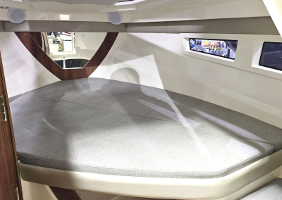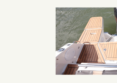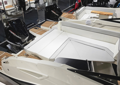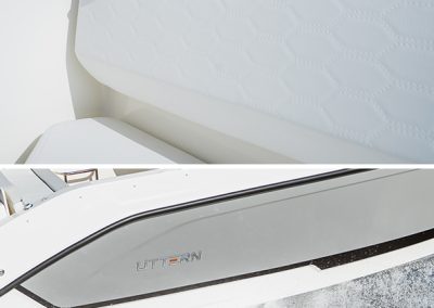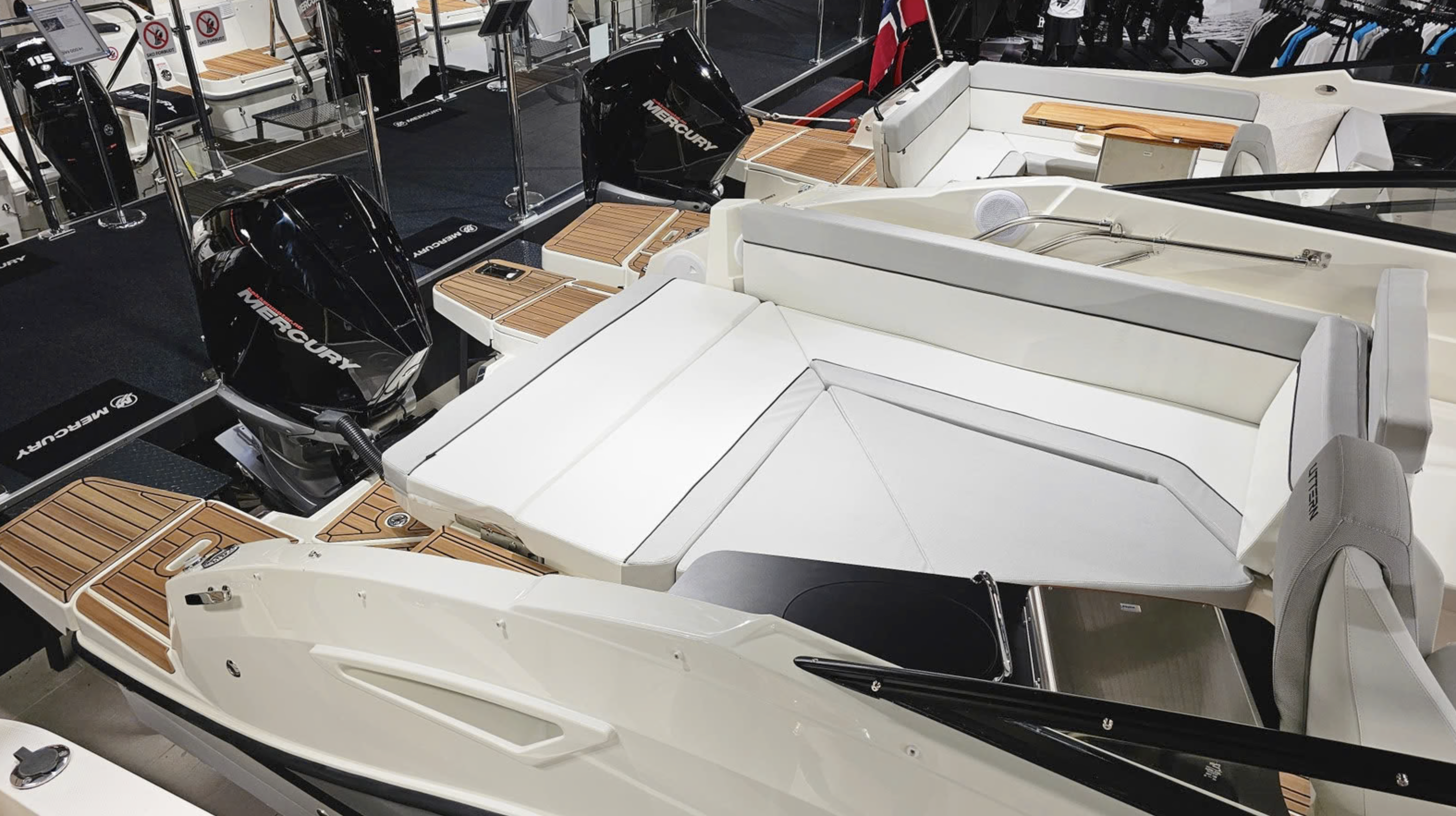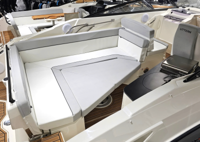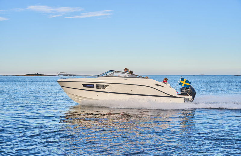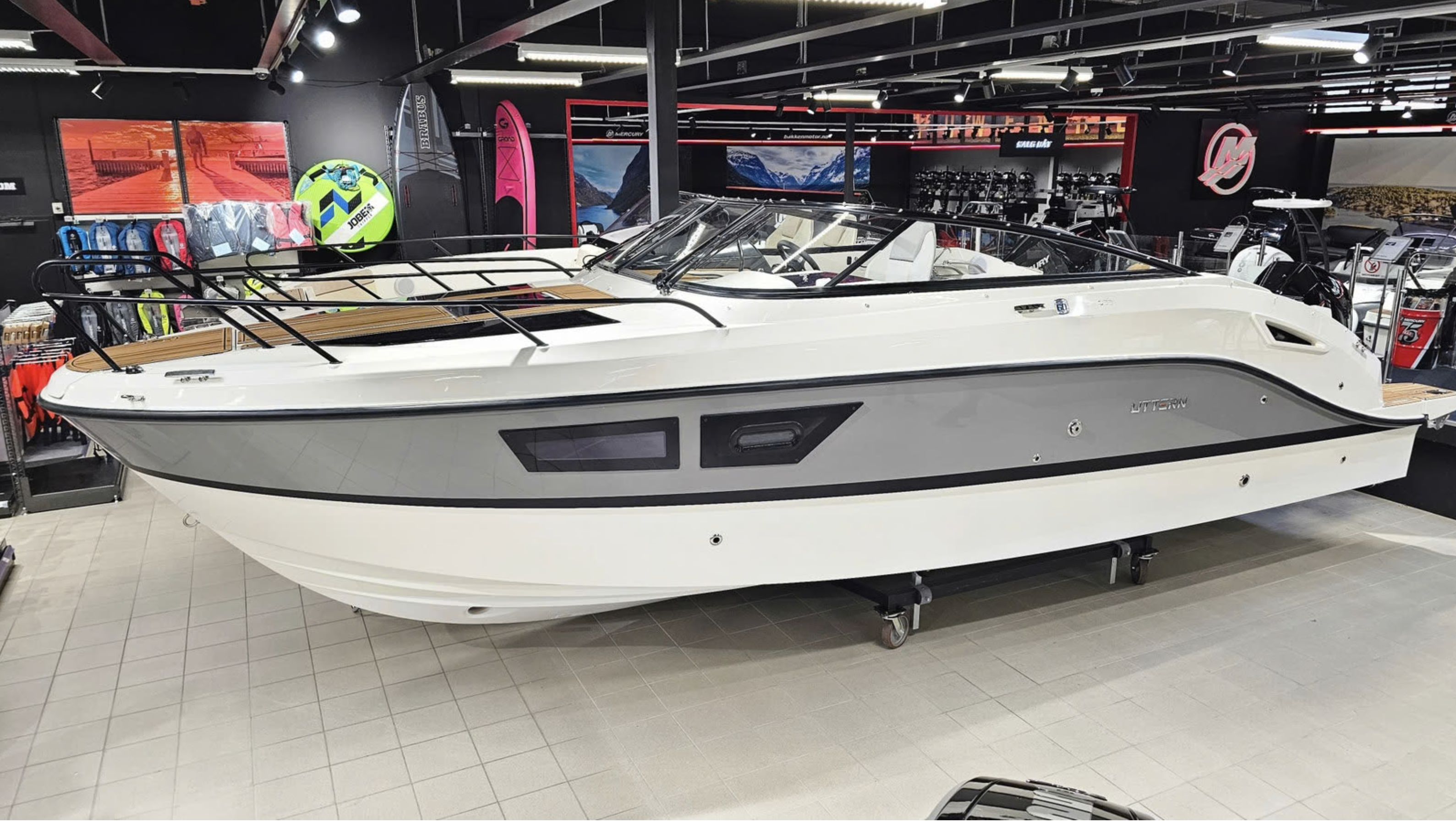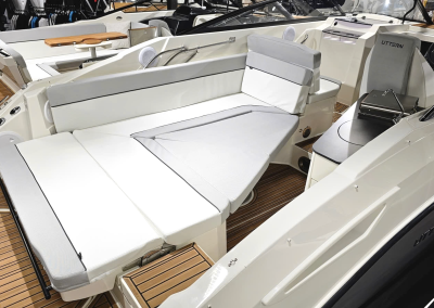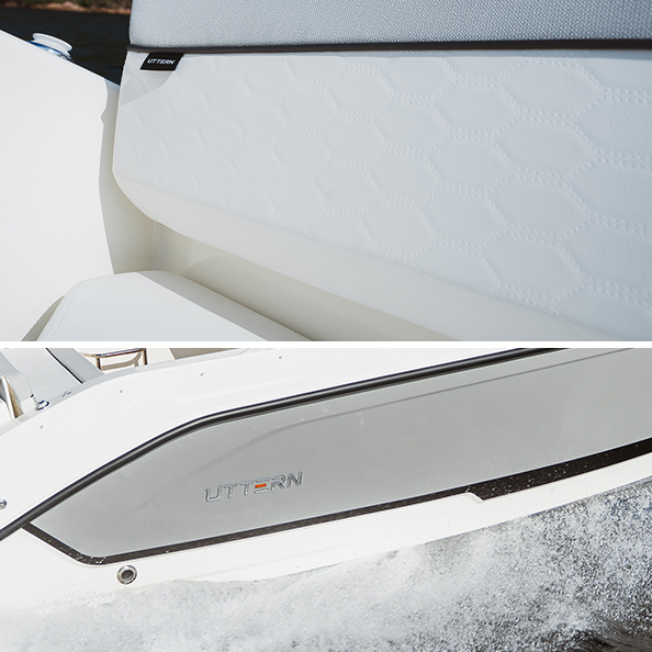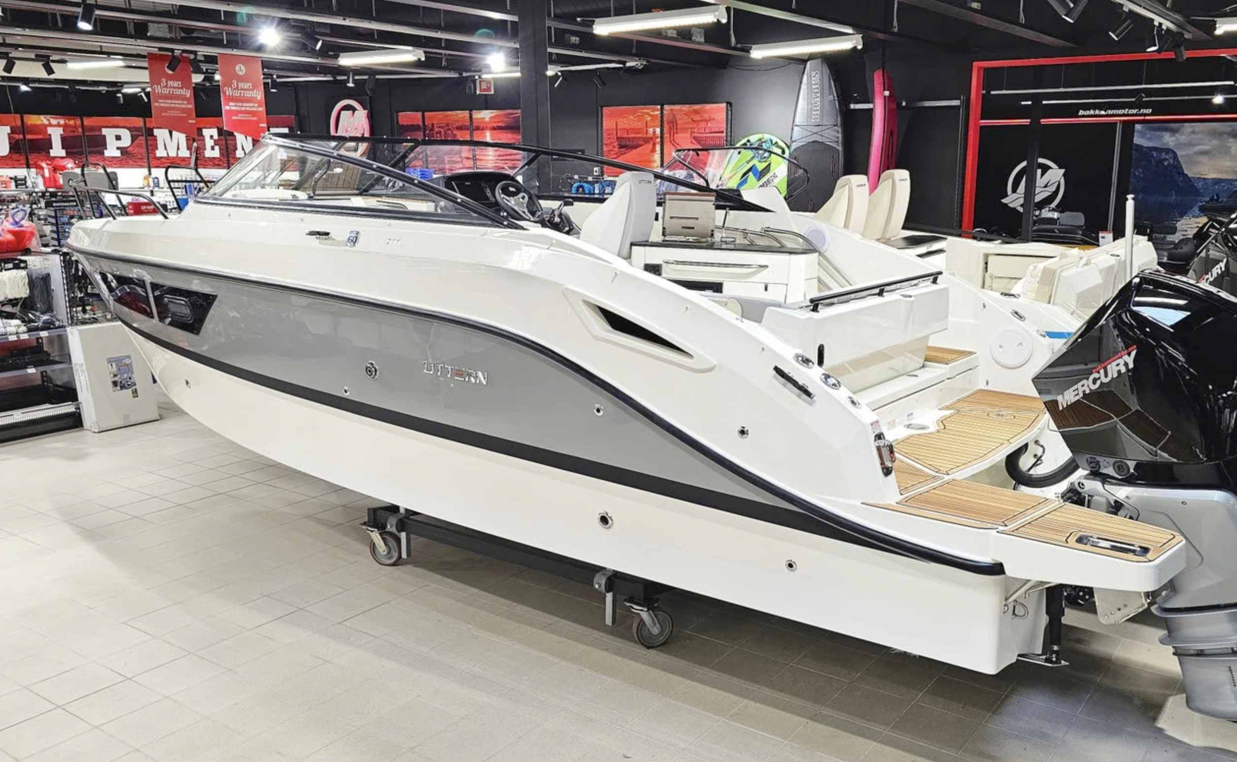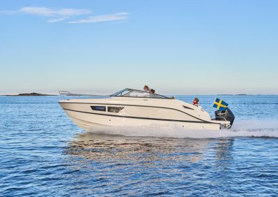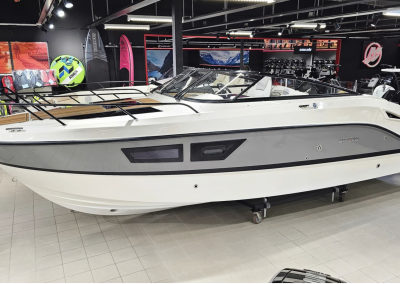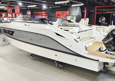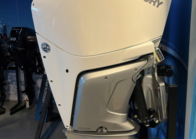 Detta exemplar är fullutrustat med bland annat landström, bogpropeller, trimplan och värmare, men har även det exklusiva Deluxe-tillvalet som innebär elegant ljusgrå skrovsidor och moderna ljusa dynor i sittbrunnen. Kombinerat med den vita 300 hk starka Mercury motorn ser båten riktigt exklusiv ut och skiljer sig markant från de äldre båtarna med mörkgrå och orange detaljer.