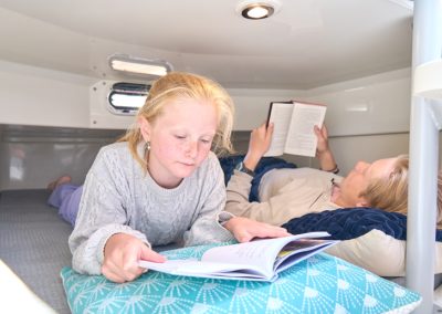 ✔️ Totalt 4 kojer under däck fördelat på 2 dubbelkojer. Någon till kan sova i sittbrunnen om man bäddar ner bordet i sittbrunnen.